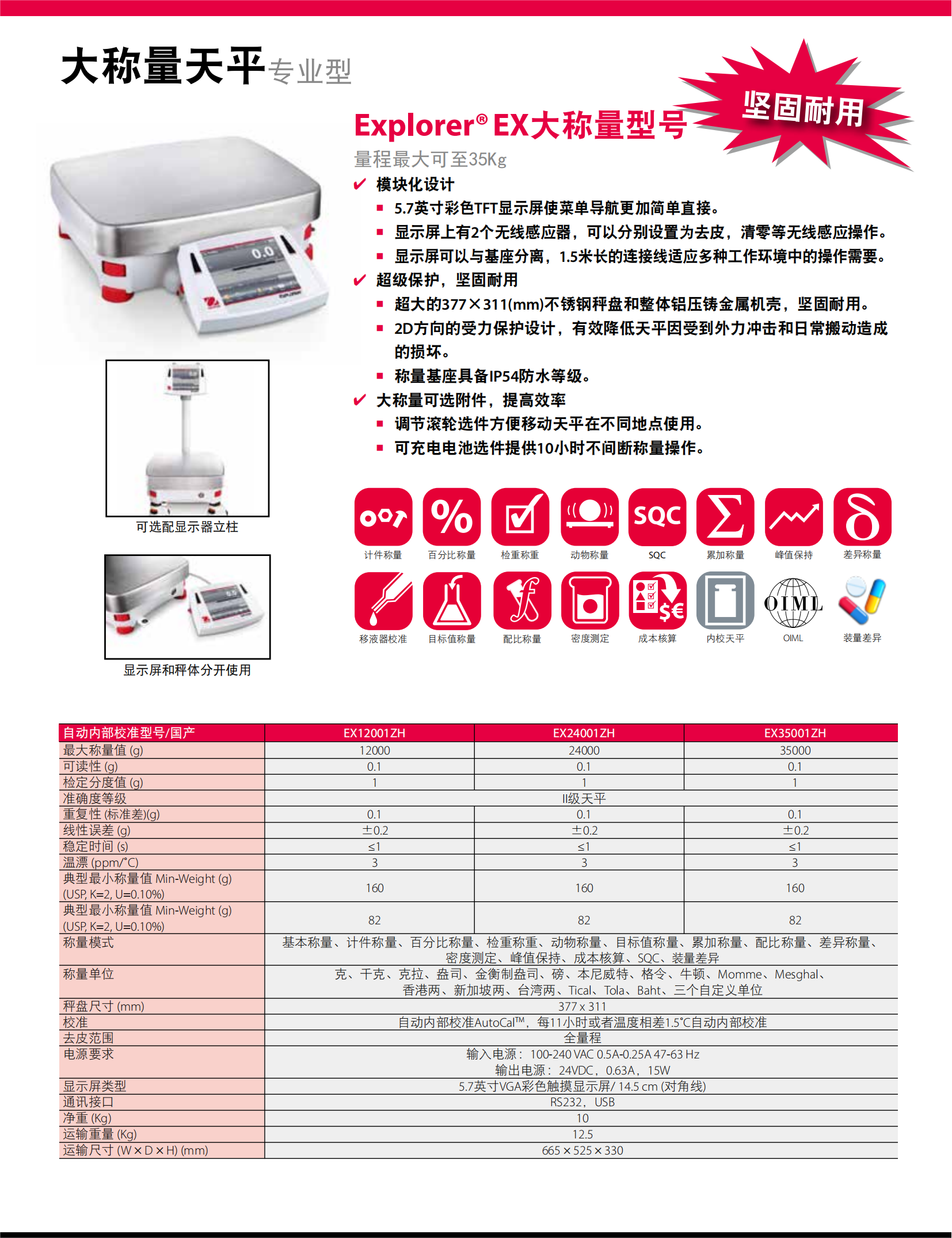 奥豪斯Explorer大称量天平提供您更直观和简便的操作体验,在市场同等级别具甚至高级别天平相比具有无与伦比的优越性。最大称量范围35公斤,配置5.7英寸全彩触摸屏,全自动校准,1秒内快速稳定。