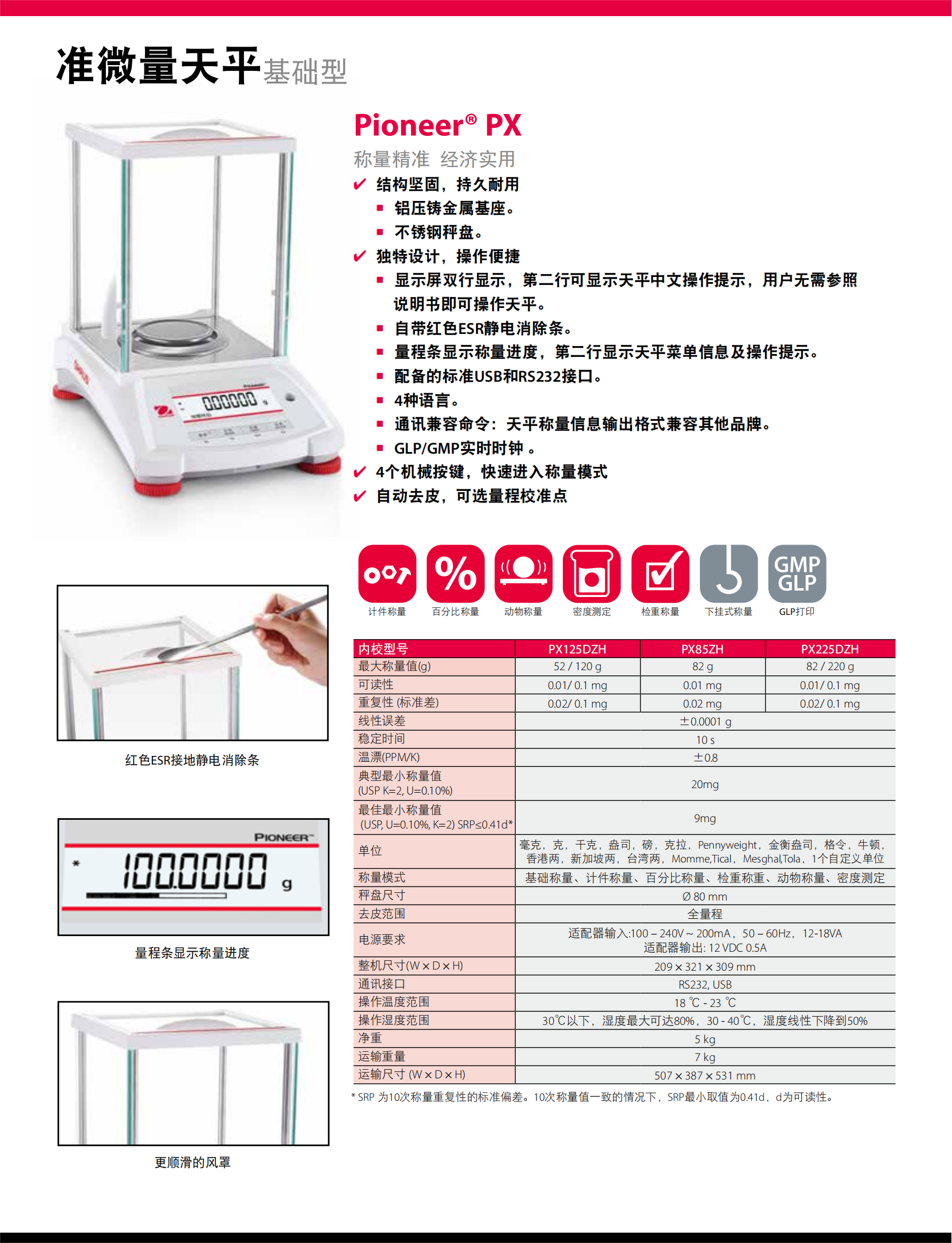 PX电子天平不仅具备称重功能,且性能优异,提供实验室、工业和教育领域中各种应用的精准需求;PX天平价格实惠、显示屏清晰直观,第二行增加了中文操作提示,标配USB和RS232通讯接口,通讯便利