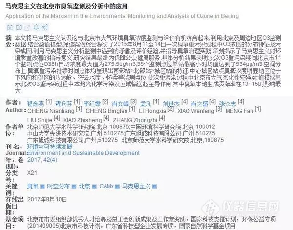 北京师范大学水科学研究院程念亮等8人在2017年04期(8月10日)的《环境与可持续发展》期刊上发表了题为《马克思主义在北京市臭氧检测及分析中的应用》的论文